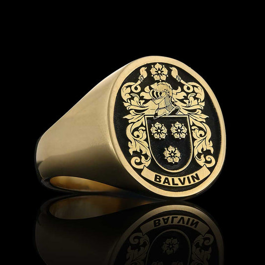Description:Pinky Finger Signet Ring with crest on shield and name in banner.