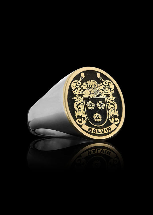 Celebrate your family heritage with the stunning Gold and Silver Family Crest Ring, an exclusive creation by Heraldic Jewelry. Crafted with a 14KT gold face and resilient sterling silver band, this custom ring symbolizes your heritage with unmatched style and quality.